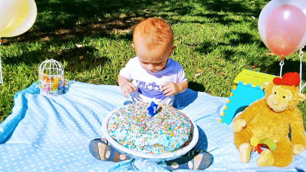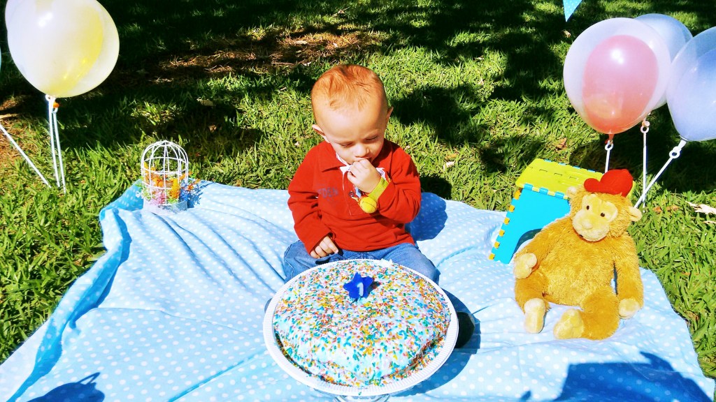 A singeleza do cenário é o que me encanta!Basta um lugar verde e alguns itens simples que a gente costuma ter em casa,como uma ”comemoração pessoal e (quase,já que nós também comemos o bolo )exclusiva do bebê que antecede e até substitui a festa.