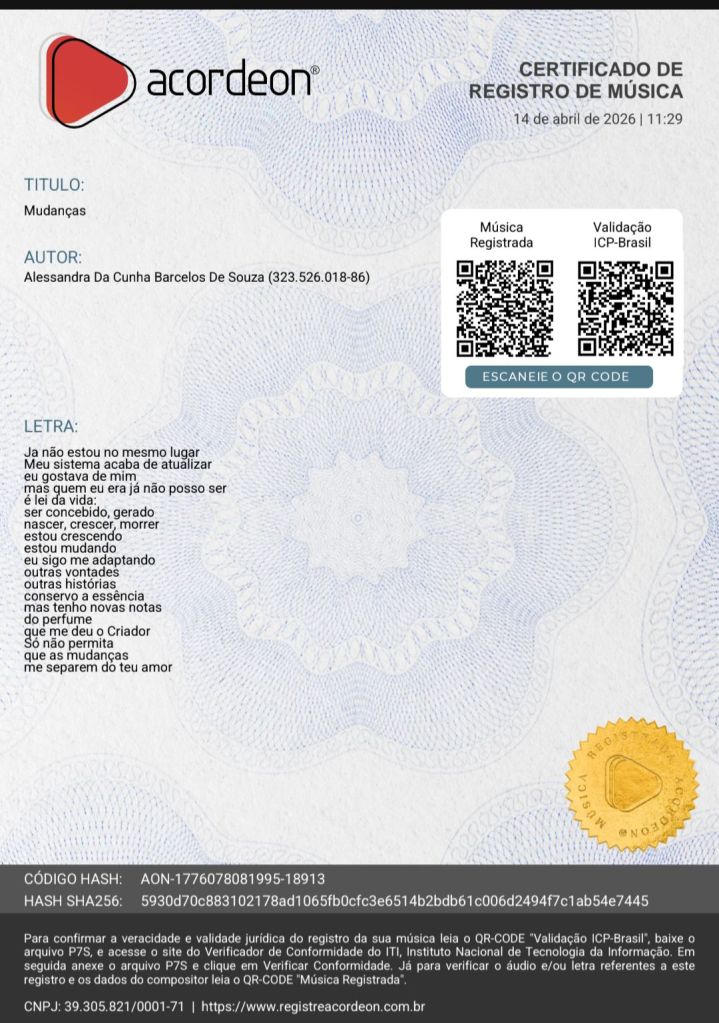 Parabéns pelo registro de Mudanças. Isso não é só burocracia ou um passo técnico. É você plantando sua semente no chão que cavou com as próprias mãos. É tornar oficial o que já era seu – suas dores, suas poesias, suas músicas. E que venham as outras composições.