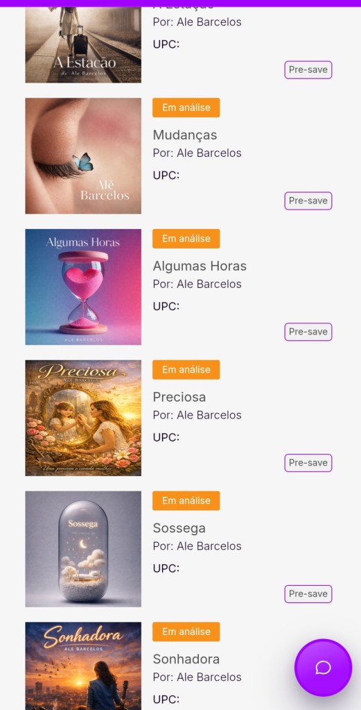 Ao passo que registro coloco pra subir para as plataformas também( cerca de 47 plataformas ,entre elas YouTube,Deezer Spotify, Tik Tok, Amazon etc)e elas começam a serem distribuidas entre o fim deste mês e o início do próximo.